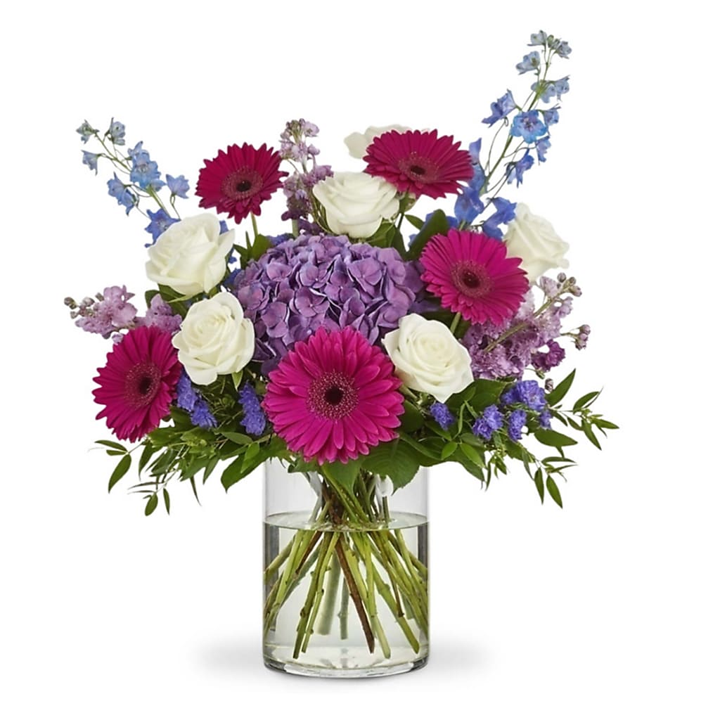 Celebrate the sparkling joy of a new arrival with Amethyst Glow, a striking and delightful arrangement. Deep purple hydrangeas create a lush base, beautifully complemented by pristine white roses and cheerful fuchsia gerbera daisies. Tall blue delphinium and delicate purple stock add height and texture, while wisps of smaller blue and purple accent flowers create an ethereal touch. This vibrant bouquet is a truly memorable and distinctive way to welcome a little one into the world.