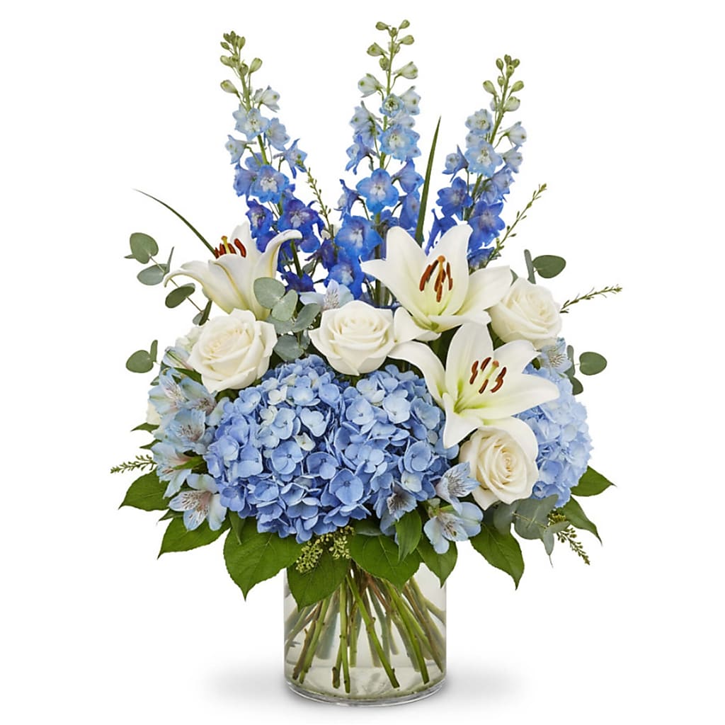 Celebrate the wonder of a new arrival with Azure Dreams, a breathtaking arrangement that evokes the serenity of a clear blue sky. Majestic blue delphinium stands tall, complemented by lush blue hydrangeas that form a cloud-like base. Pristine white roses and elegant white Asiatic lilies symbolize purity and new beginnings, while delicate blue alstroemeria adds an intricate touch. Accented with soft eucalyptus and vibrant greenery, this luxurious bouquet is a perfect and memorable welcome for a precious baby boy.