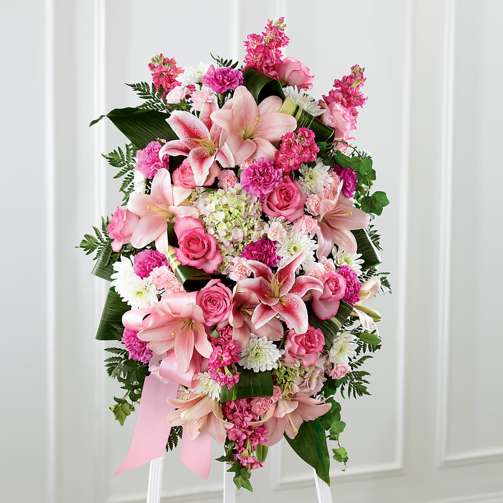 Our Comforting Standing Spray combines blushing blooms in a classic standing design to elegantly accent your messages of heartfelt sorrow. Crafted by our talented designers, this grand tribute is a beautiful array of hydrangea, lilies, stock, roses and more. It makes a stunning display at any memorial service for the passing of a loved one.