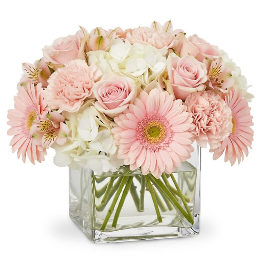 Celebrate the sweetest new arrival with the Cuddle Bug, a perfectly petite and endearing arrangement. Soft pink roses and cheerful light pink gerbera daisies create a heartwarming blend of color, complemented by fluffy white hydrangeas and delicate pink alstroemeria. Playful pink mini carnations add a charming texture, all thoughtfully arranged in a modern cube vase. This delightful bouquet is a tender and joyful gift, ideal for new parents.