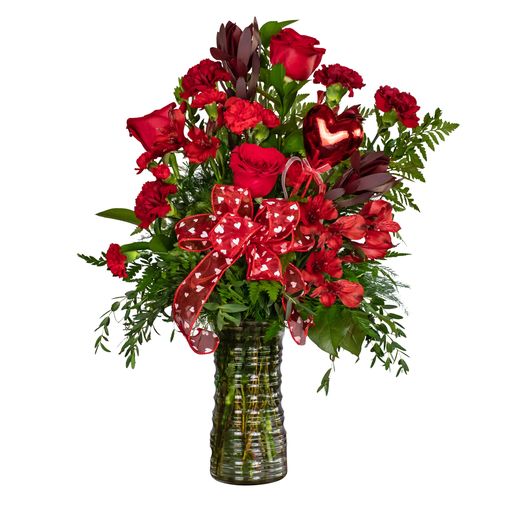 You love is sizzling. Heart on Fire will ignite your lover's passion. Deep red flowers like roses and carnations are nestled in greens in this tall cylinder. Approximately 19"W 24"H