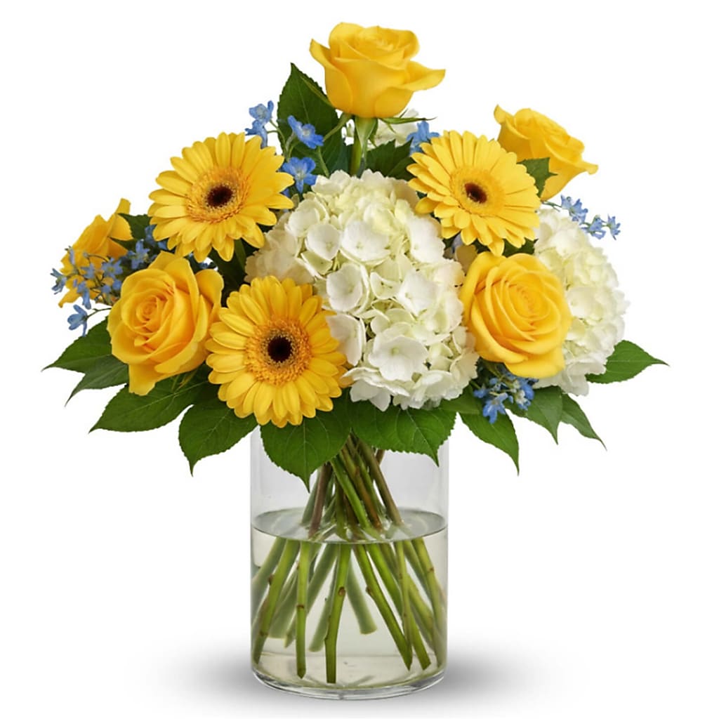 Brighten their day and celebrate the newest arrival with Little Ray of Sunshine. This cheerful bouquet bursts with radiant yellow roses and sunny yellow gerbera daisies, symbolizing joy and warmth. Fluffy white hydrangeas create a soft, cloud-like base, while delicate blue delphinium accents evoke the clear skies of a beautiful new beginning. Adorned with fresh greenery, this arrangement is a perfect expression of happiness and hope for the proud new parents.
