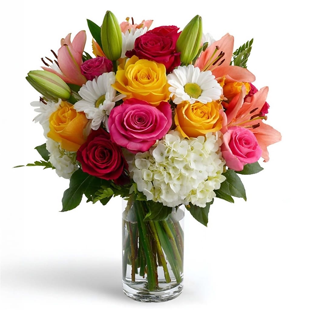 As joyful as a celebration and as colorful as love itself, Love Confetti bursts with radiant roses, bright lilies, and playful daisies. It's a lively mix that speaks to the spontaneous, spirited side of romance - a bouquet that says "you make life more fun"