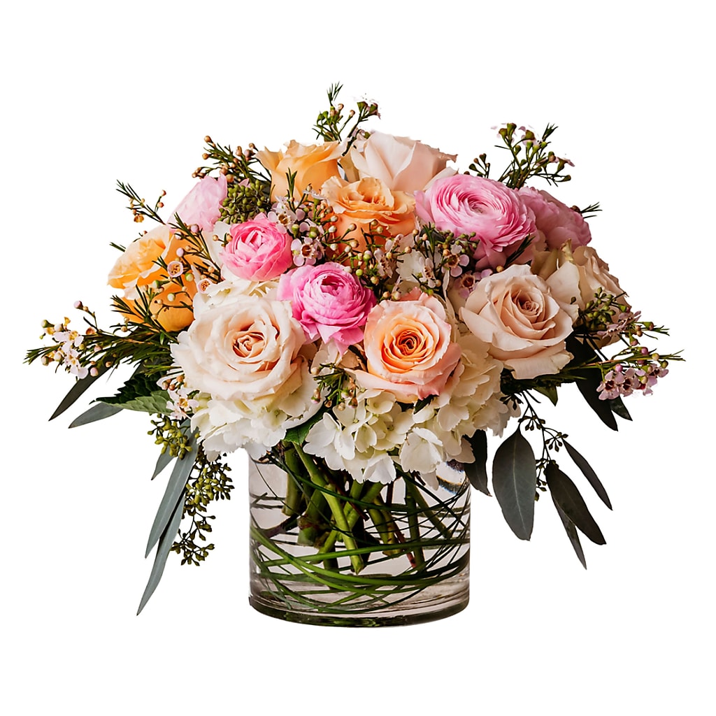 She's soft, she sophisticated. Mabeline will steal their heart. Pink and peach roses are paired exquisitely in this cylinder vase. Approximately 17"W X 12"H