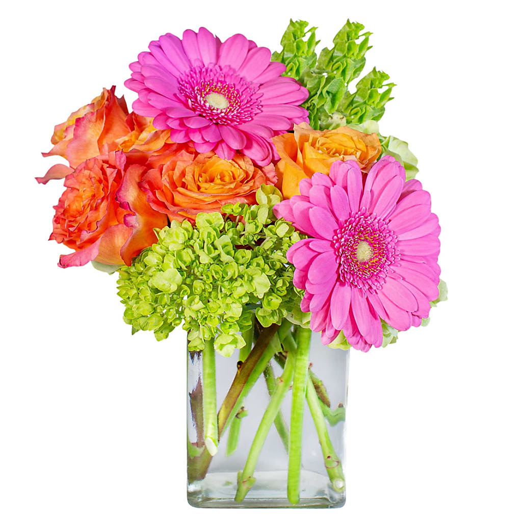 Orange, raspberry, or lime anyone? Rainbow Sherbet is sure to please the senses. Orange Roses, Hot Pink Gerbera Daisies, and Green Hydrangea are tastefully arranged in this cute vase. Approximately 7"W X 12"H
