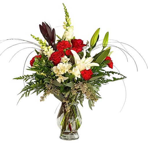 Sparkling, precious, and perfect! Rubies and Diamonds will bring a twinkle to your loved one's eyes. Flowers like lilies, carnations, and roses in red and white hues are real gems in this arrangement. Approximately 25"W X 26"H