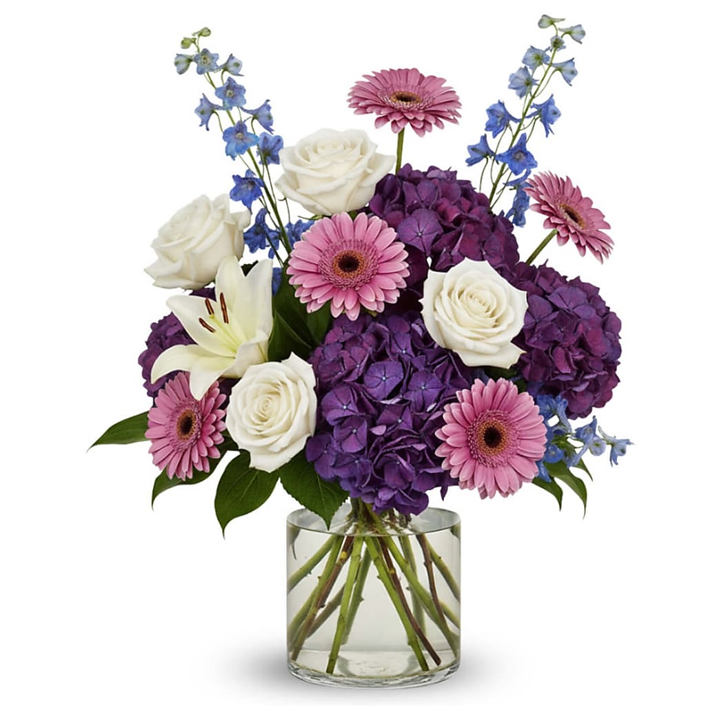 Welcome the newest star with Starlight Serenade, a captivating arrangement that combines elegance with joyful pops of color. Deep purple hydrangeas and towering blue delphinium create a dramatic, dreamy backdrop, reminiscent of a midnight sky. Pure white roses and graceful white Asiatic lilies symbolize innocence and purity, while cheerful fuchsia gerbera daisies add a playful, celebratory spark. This luxurious bouquet is a stunning tribute to the magic and wonder of a new arrival.